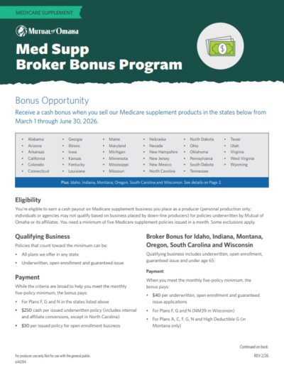 Starting March 1 through June 30, 2026, the broker bonus payout on underwritten Medicare Supplement applications has increased to $250 per application in participating states.