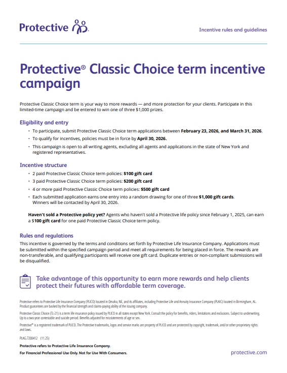 Earn based on the number of paid Protective Classic Choice term policies (must be in force by April 30, 2026):